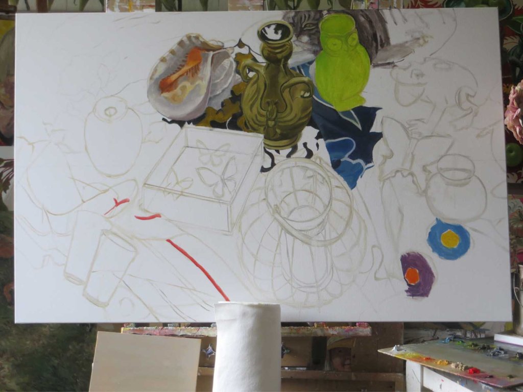 Ah, the craziness of summer! I’d started this one last Wednesday, just the drawing-in. Then there were 2 days of a plein air event, followed by a day of gallivanting around northern Michigan with a friend. Yesterday I finally carved out some time to work on this. Normally I’d paint in all the darkest darks before moving on to other colors. But this was kind of an experiment. My thought was to try to paint in the stuff at the top so that I could eventually have a day or two to SIT IN COMFORT — for a change.
