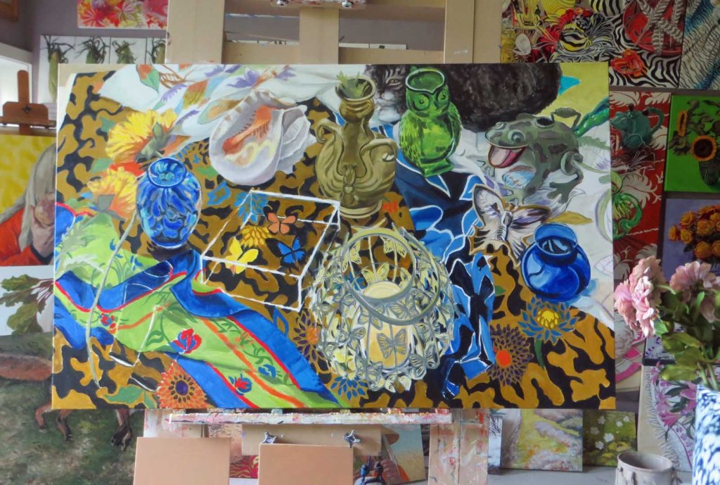 Most of the canvas is covered, thank goodness I finally had a long, peaceful afternoon to work in the studio yesterday . I hope things are dry enough to start putting in details. We have rain today, so gardening chores are kaput. No berry-picking, no weed-pulling. No dragging hoses or pushing wheelbarrows. Oh darn!