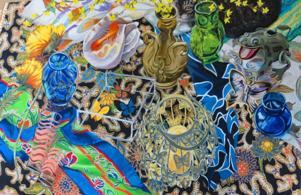 Can you find the cat? As soon as I set this up, Mr. Wonderful jumped up onto the table and declared this spot HIS (upper right). He camped out there most of the time while I painted. I threw this assemblage together, using some of my beloved treasures from estate sales and Goodwill. It’s got a kind of a “butterfly-moth” motif running throughout, inspired by the antique brass moth vase (center). The cut-out butterfly lamp is quite the booger to paint, but will I stop painting it? Naaaaaaah! The first 100,000 times are the hardest; after that it’s a snap! The orange-striped glasses may look a little familiar. I’ve used them many times. The stripes fascinate me. Horrible, yet wonderful. They’e boogers to paint, too. Everything is. At times I thought my eyes would fall out, painting all those dots in that fabric. But it’s been a blessed break from pulling weeds in my garden on those hot days.