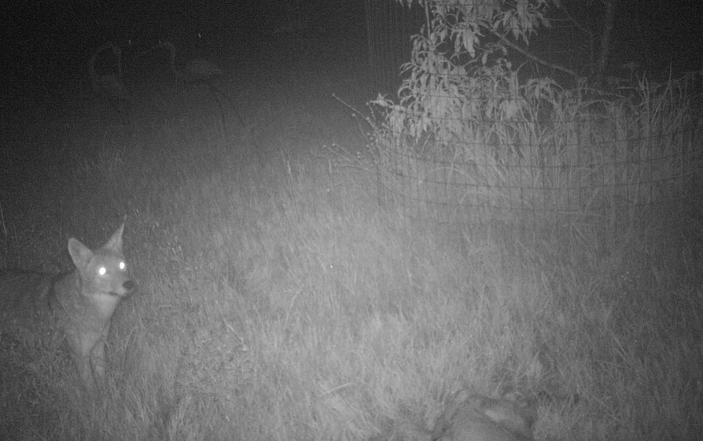 Meanwhile, the vultures circled the dead fawn out in the field as the cats hid in the bushes, worried about the monster trucks. And — in case you were wondering what I caught last night on the trail cam, it was Mr. Coyote. No, the fun never ends here at Possum Hollow Studio!