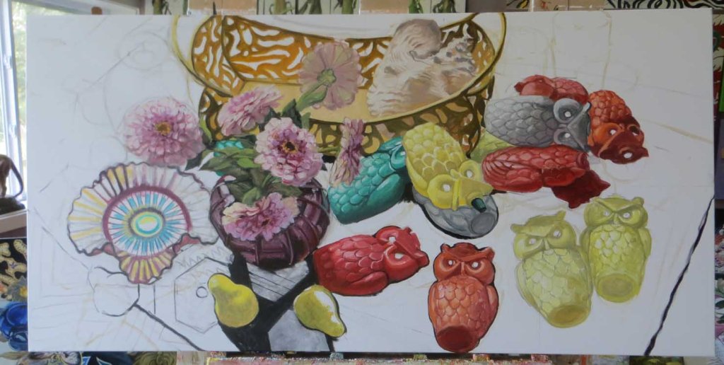 Yes, more owls today. I think that’s the last of them. I hope. Except for the eyes. Dared to play with the zinnia petals a little more. And then there’s that yellow metal basket with the conch shell bringing up the rear. All the while I was serenaded from 7:30 AM until about 4 by two massive tankers of tar, idling on the road in front of my house. I don’t know if they moved all day or not. They never shut their engines off even once. I wanted to run out and slap them. I thought of my neighbor ladies in their sweat lodge, trying to meditate and be spiritual amidst the racket and diesel fumes.