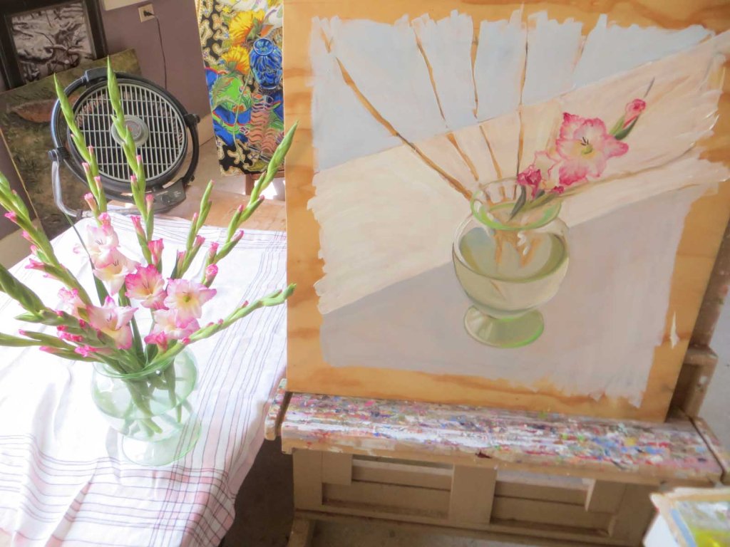 I bought these gladiolas two days ago, cut them twice and put in warm water. Still waiting for all of them to open up. While waiting I did a lot of gardening and cleaning up in the studio. Finally this afternoon I grabbed a board and started laying in a painting. I usually give my prepared boards a thin coat of oil paint to tone them. This board (which fits a really cool twig frame) had no toning, so I kind of just slapped paint on. Finally at the end I painted in one or two blooms — just to see how they’d look.