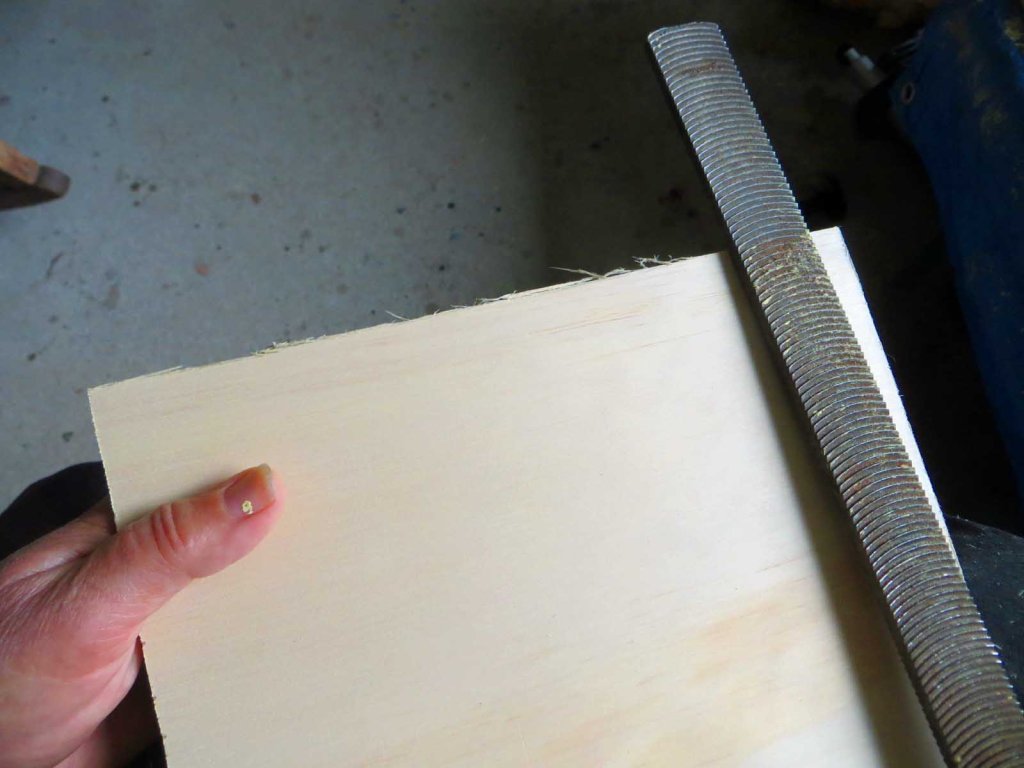 I’d always thought I was buying birch plywood, but I was told it’s actually pine. Whatever the actual wood is (!), the stuff I use comes in 4 x 8′ sheets and is 1/4″ thick. There are varying degrees of quality (and price) to consider. The most important thing is to make sure one of the sides is blemish-free.