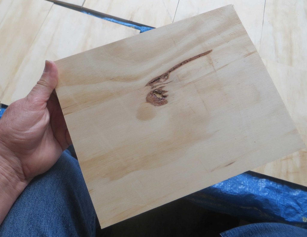 To get started, lay a plastic tarp over your work table. Warning: it’s a messy job! And please wear an apron to keep the mess off your clothes. It’s best to work on a concrete floor that can be swept off. Avoid doing this on your living room carpet! Once you get the tarp down, begin laying wood pieces with the bad side facing up. Below is a photo of the “bad side”. It’s got a big knot in it. You don’t want to paint on this side. Be sure all the smooth “good” sides are facing down at this point.
