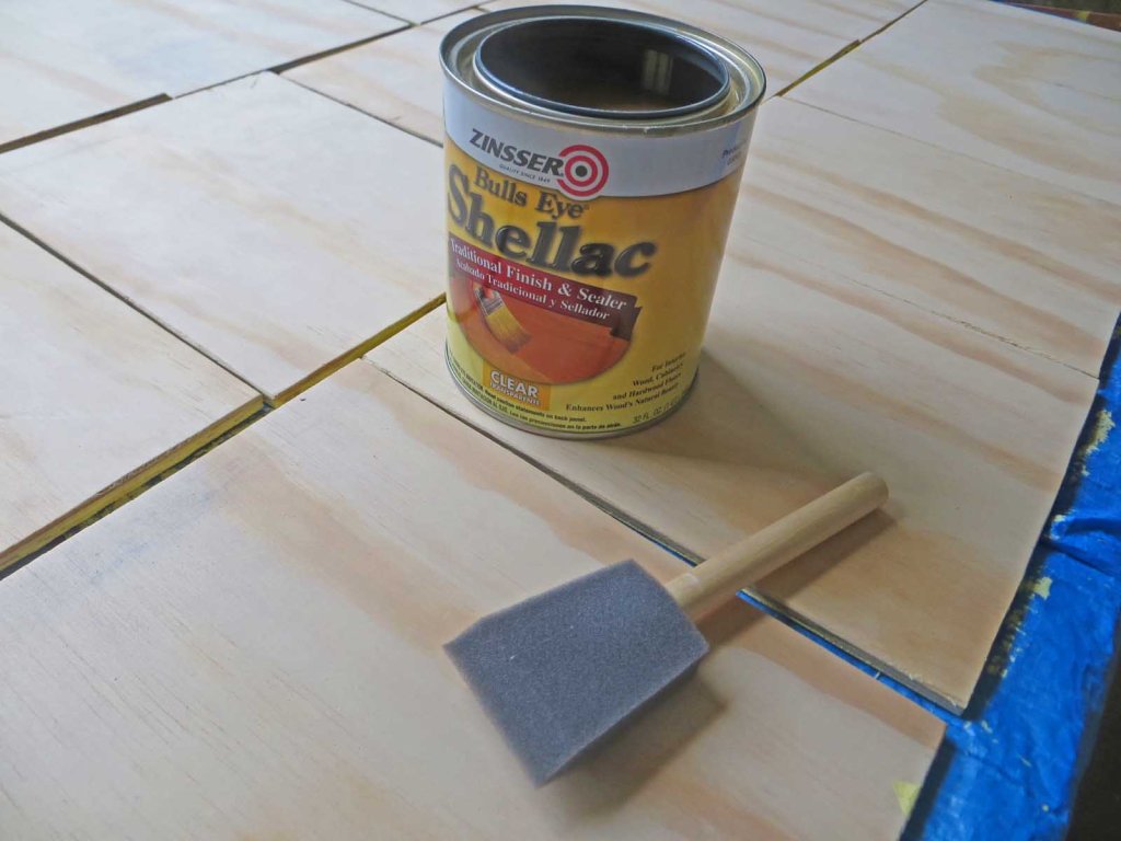 Now flip all the pieces over so the good sides are up. Using a foam brush, give one coat of shellac. I prefer the clear shellac, but maybe you’d prefer the amber. You’ll notice it soaks into the wood, raising the grain. Don’t worry….