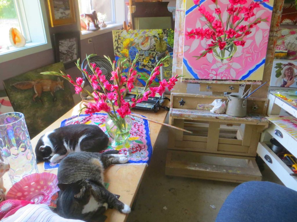 I’m surprised I got as much done as I did today. In the beginning it looked so hideous, I had to leave for a while. Went to the art opening over at Jordan River Art Center, then drove home through a heavy downpour. I guess it was enough to make me more determined to “tackle those glads”. I knew it was time to quit when the cats were obliterating my view of the setup. That’s Picasso (top) and Mr. Wonderful.