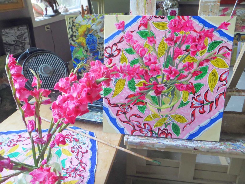 This was one of those experimental paintings. The tough part was not so much the flowers, but the scarf. I used a #0 round Kolinsky sable to draw in some of the details. I’m not going to put in everything, but I wanted to see if a super-busy scarf like this would work out OK. It’s almost like the background is busier than the main subject. It’s certainly not the traditional way to do a still life, but I felt like experimenting. At one point this afternoon I had to take a break and go out and mow the lawn just to clear my head.