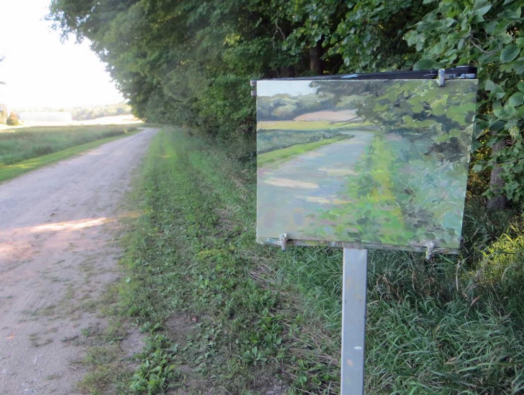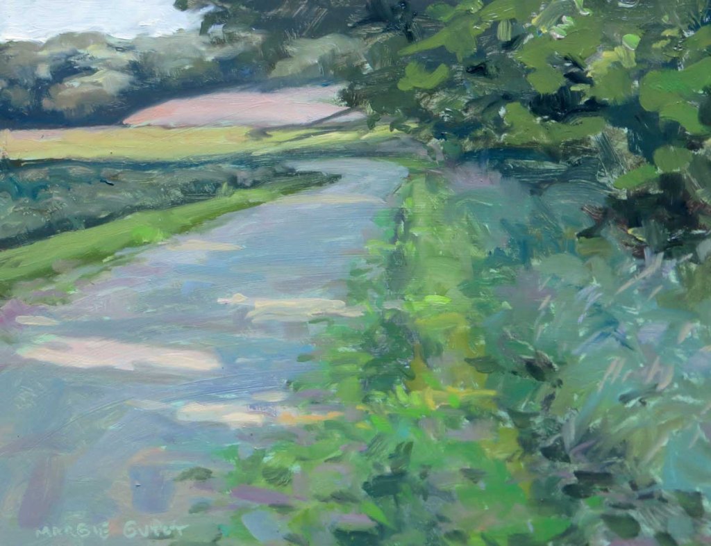 After having spent weeks (months?) painting difficult and complicated still lifes, when I finally found this spot and started painting, I felt like I’d died and gone to heaven! I’d been driving east on Old State Road, heading towards Central Lake, when I glanced at Burns Road. Ah — those shadows! I had to do a U-turn and go back to paint it. Actually I think Burns Road is really some guy’s long driveway. I painted fast and furious, hoping to get it all in before the spots of sunlight disappeared. I really enjoyed being out there and painting this afternoon!