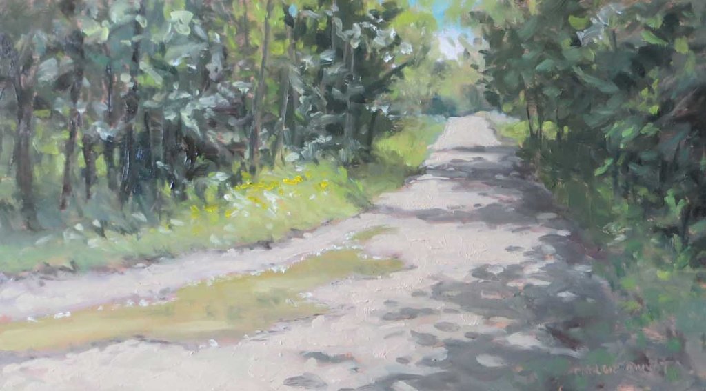 My right shoulder was pretty sore from all the digging lately, so I came home and had an Aleve and a cup of coffee. Somewhat revived, I headed north, to Norwood, where I painted this view of a mud puddle in the road. I thought it was more interesting than waves crashing on the beach. I love the color of the muddy water. And shadows across the road are on my list of “favorite things to paint”. Tricky, though! Some people make them way too purple. A very peaceful spot!