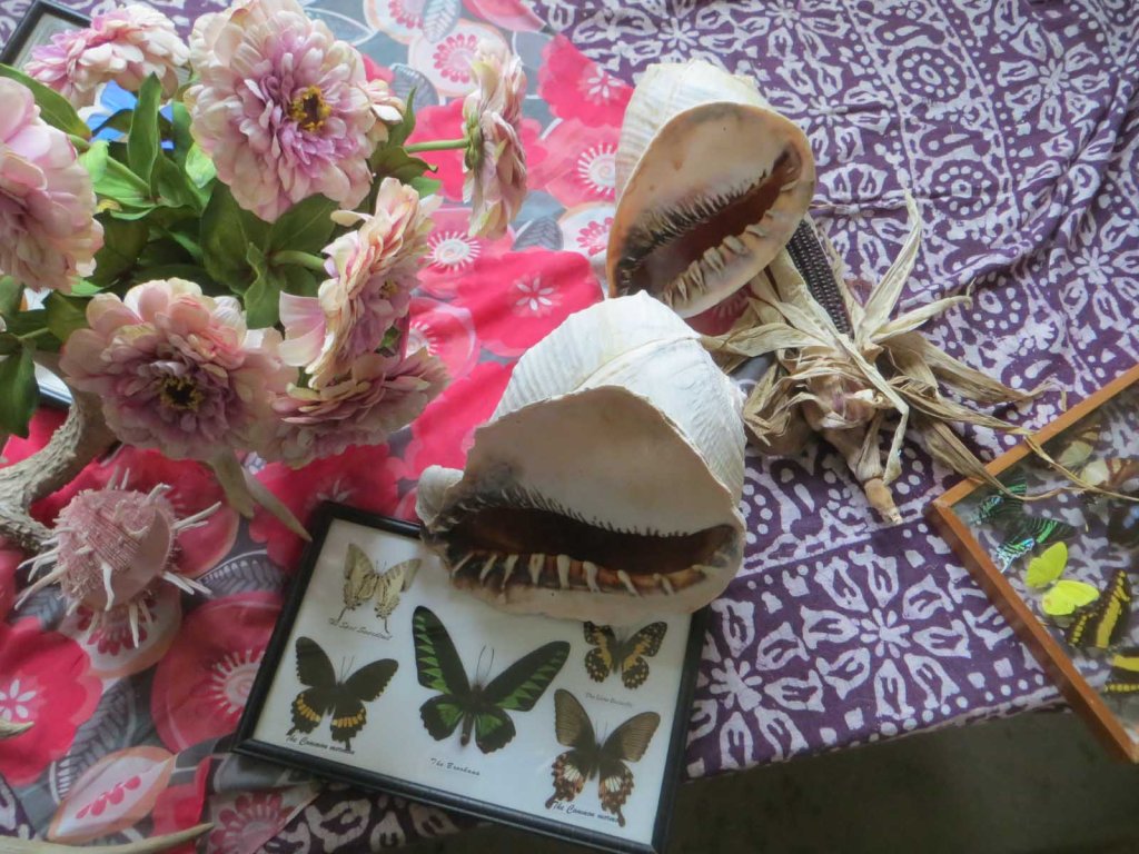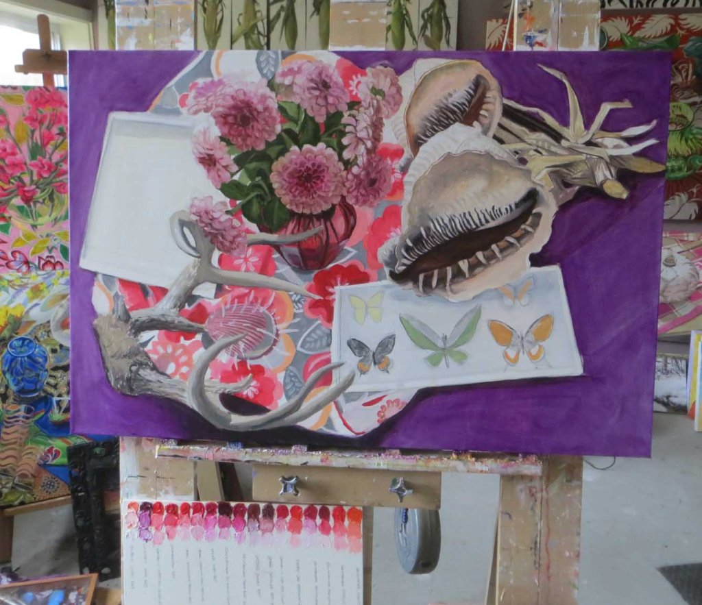 Another very dark, gloomy day out here in northern Michigan. It’s kind of surprising to see how dark-looking the shadow size of the zinnias are. They were a lucky junk-shop find last summer, made of “silk”. I also started mushing-in the butterflies. It was harder than you’d think. And don’t get excited about the purple background. It’ll have a lighter design to it (see below).