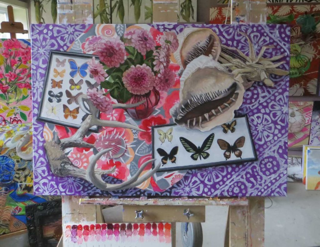Another cold, dark day here. Perfect for tackling that old hippie bedspread. I think it’s batik. One of the treasures I’ve snagged at a junk shop. Listened to opera all afternoon, occasionally handing out cat treats to demanding, insistent cats. I also started smearing in the tray of butterflies (on the left). Butterflies are hard! Everything is hard! I need a nap.
