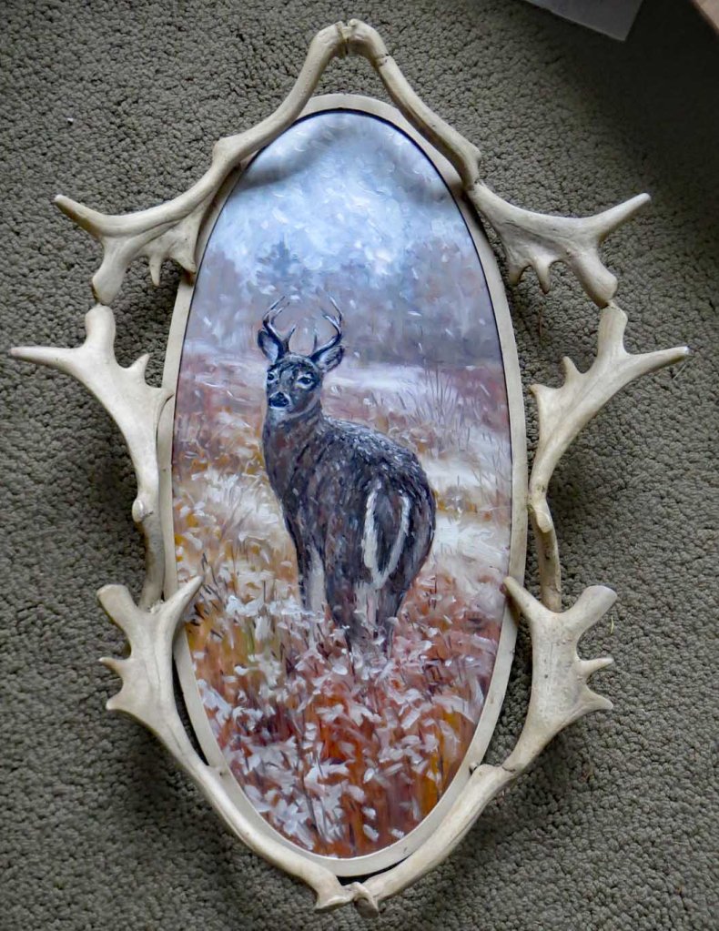 I’d found this frame in a resale shop last spring. It’s actually metal. Had my handyman cut some 1/4″ plywood to fit. I wasn’t sure what image to put in it, but last week I knew it would have to be a deer. Up here in northern Michigan, deer season is quite the event. Almost bigger than Christmas. I see deer as troublesome, naughty creatures that chew up my flowers, so I’m happy for the hunters. A few days ago I began trying to draw this in but it was a struggle. Would I ever get body parts looking right? Ears and horns the right size and angle? Ever so many ways to screw up! And then what to do with the background? Yesterday the first big snowstorm of the season blew in and that got me all excited. I flew out to the studio and kept staring out the window, painting just how it looked in my yard. Piece of cake!
