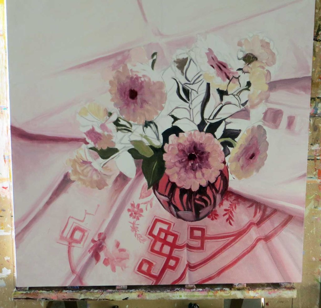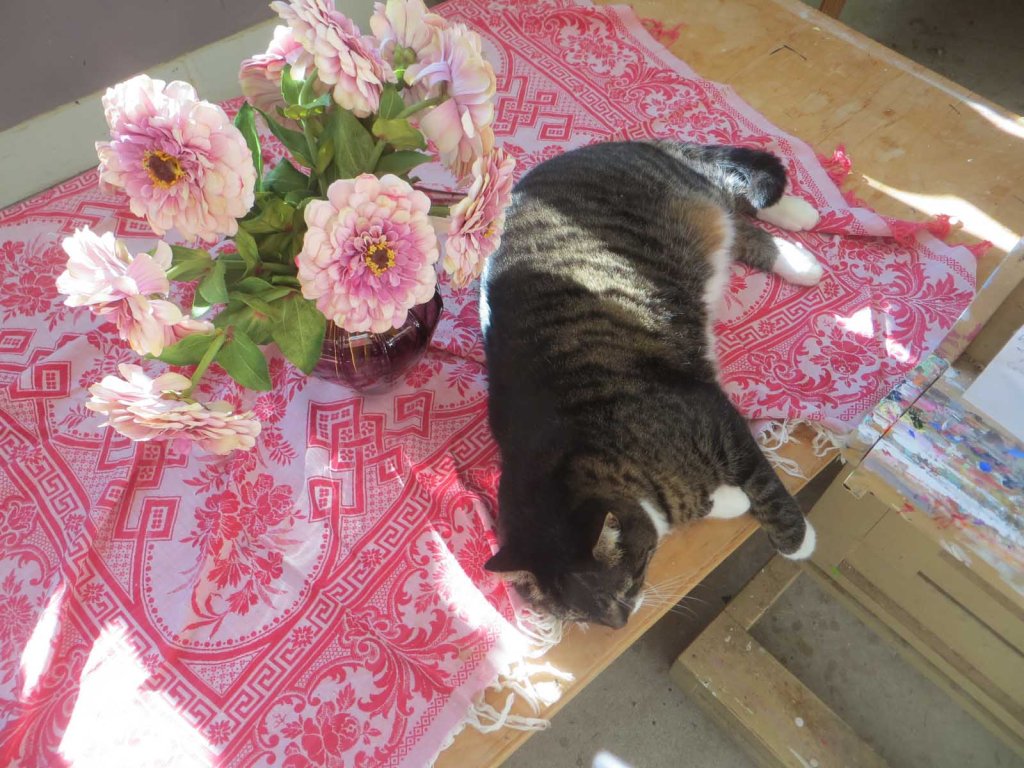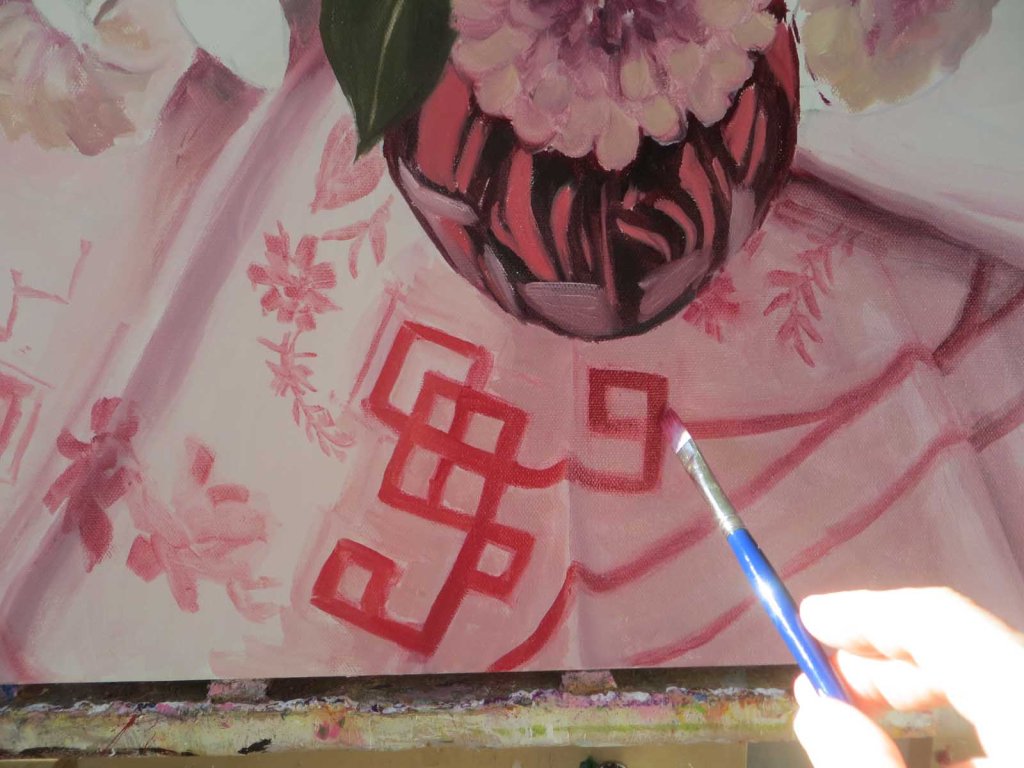 I love my boys, but sometimes they’re a handful, endlessly begging Momcat for treats. Complain, complain! And then there’s the rare sunny day. Rather annoying. It creates a whole new set of problems for the still life painter. All of a sudden there are blindingly-bright patches of sun and deep shadows. The colors are all different. I did what I could today to try to at least lay in some of the fabric design.