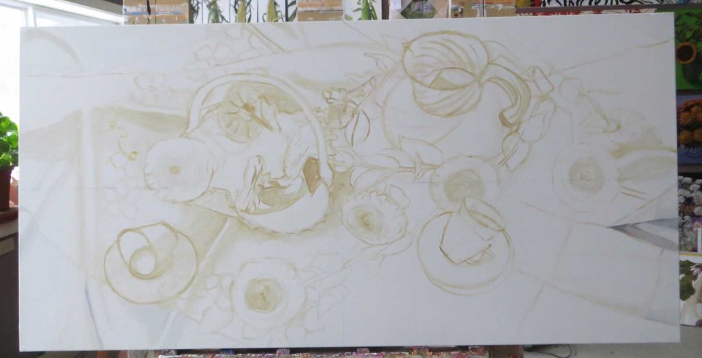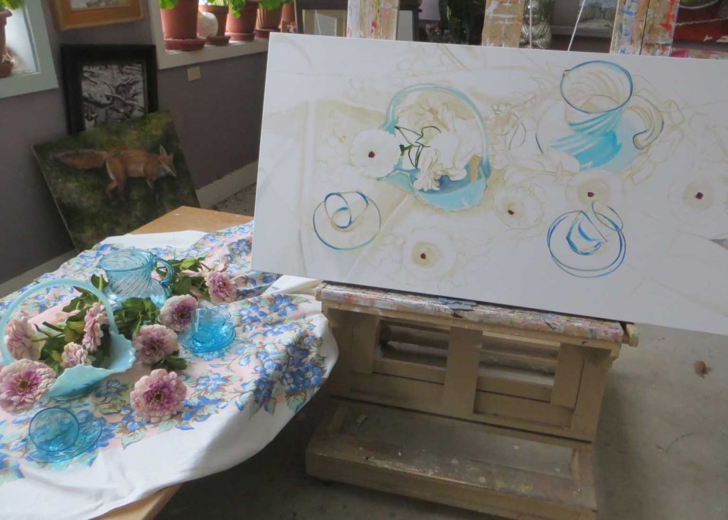 The other day I took an alternate route back from Petoskey and stopped in at a junk shop in Walloon Lake. Found this gorgeous tablecloth and knew it’d be great in a painting. This is my setup (above). Those zinnias are actually silk. I just love them. I think this is my 4th or 5th painting with them. Who knew a series could be such fun?