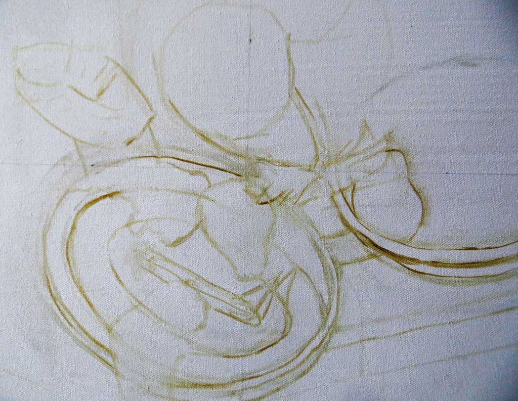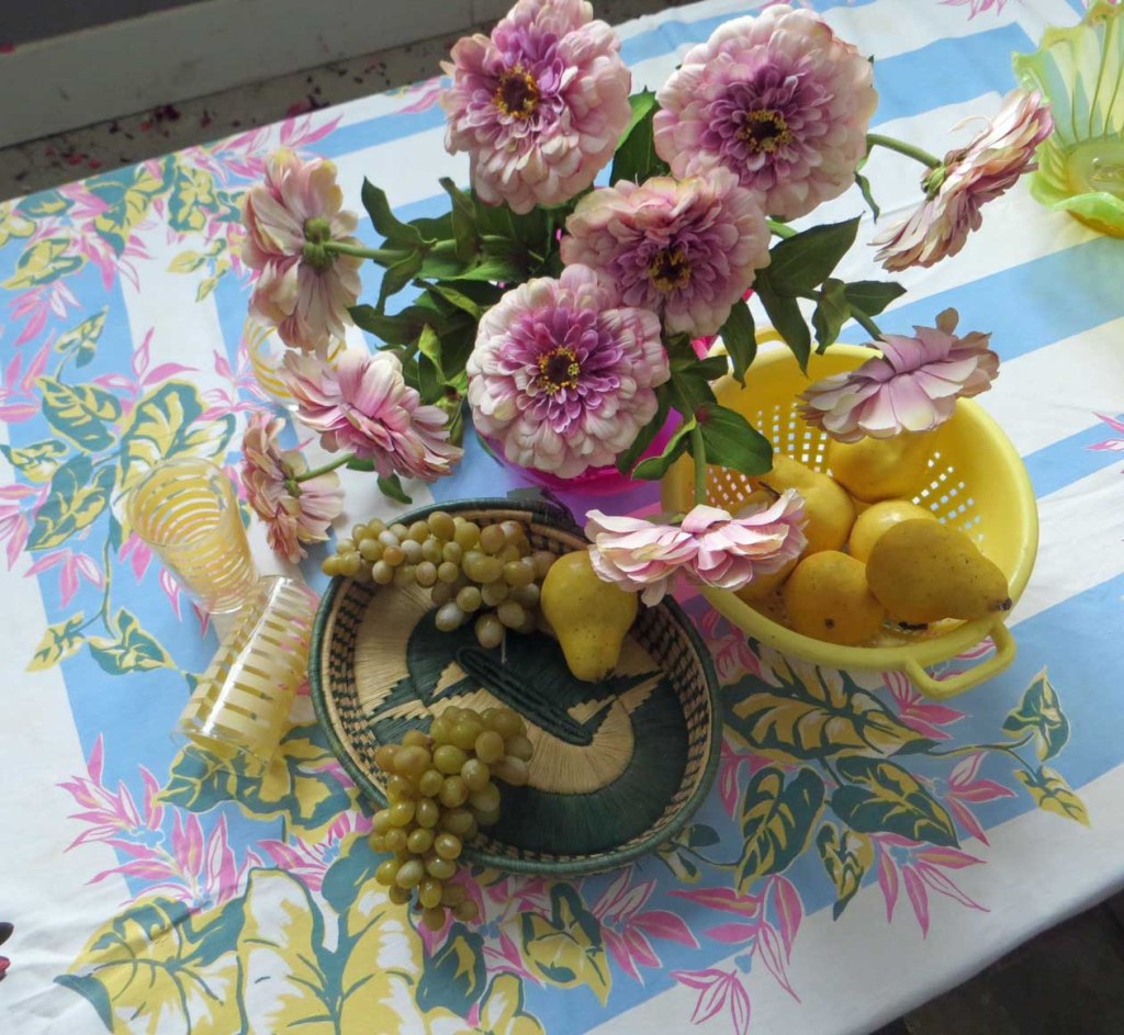 Good old silk zinnias — they never die! So I’ll paint them again. I love this vintage tablecloth! Had some errands to run this morning so I didn’t get too far with drawing it in today. I quit early, too, to make a pot of soup. Here’s how things looked when I quit for the day: