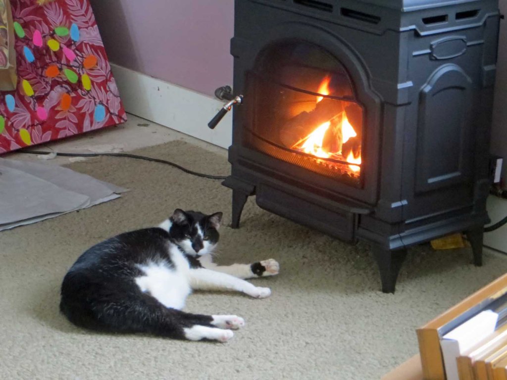 And here’s Picasso in his favorite spot, snoozing in front of the heater. He stays there all afternoon, listening to classical music. Only stirs occasionally to come over and bug me for cat treats. Whatta life!