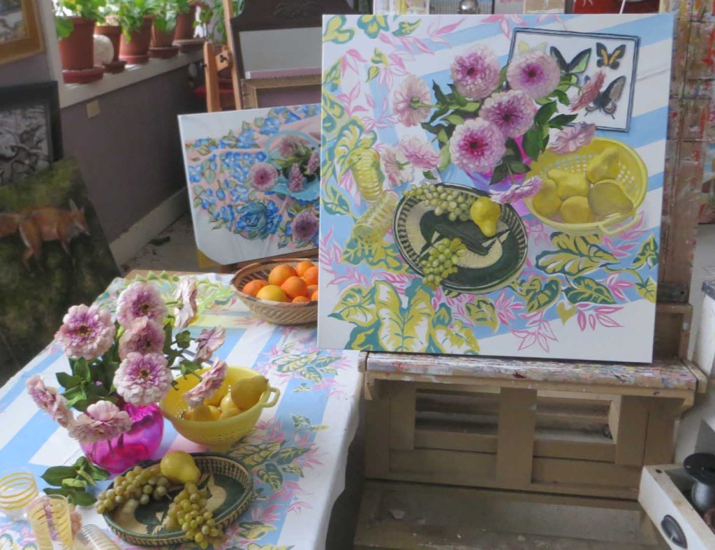 I suspected the upper right portion of this painting was looking just a tad bare. Too empty. Oh, what to do? What to do? I ended up adding a tray of mounted butterflies. Not only do they help balance the composition but I realized one of the butterfly’s wing patterns was echoed by the pattern in the woven basket in the foreground. Which is good, according to the great wildlife artist, Robert Bateman.