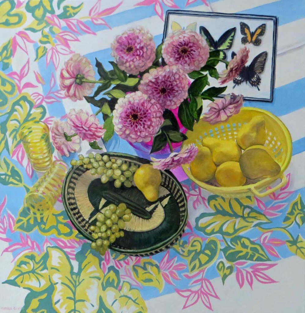 A good day to stay home and finish this. The high temperature today was about 10 degrees and we’d had about 6 or 7 inches of snow. After shoveling the usual paths to the studio, the garage and the compost pile, I’d run out of excuses to get back to the still life. I lightened the foreground a touch and fussed with the zinnia petals. I suppose I could keep pecking away on this for weeks, but I’m calling this one “done”. Hmmmm… what will be the next zinnia painting?
