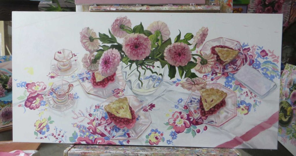The two pie slices on the right magically appeared today. And the beginnings of a napkin as well. The challenge was to try to make the plates look flat and sitting further back on the table. Kind of tricky. And the reflections and shadows are an eternal struggle. I usually wake up in the middle of the night and sense how to handle a problem. Last night I woke up and waited patiently for the “mystic message” but got nothing. Hmmm…. Maybe “it” figured I was on the right track and would figure it out on my own. Maybe! We’ll see in a few days.