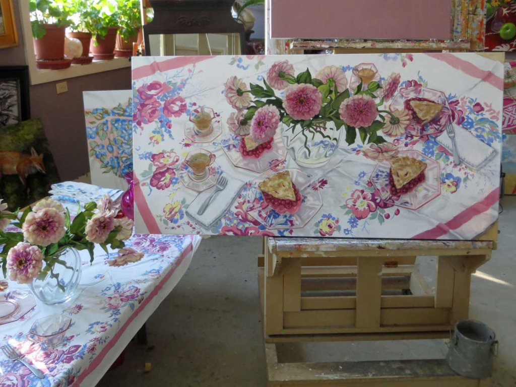 We had an unusually sunny day here, flooding my painting surface with blazing light. Sounds fabulous, but it’s awful. Makes it next to impossible to see what I’m doing with all that glare and sparkly stuff trying to blind me. I’d considered bundling up to go out plein air painting, but didn’t. The high today was something like 10 degrees. And few galleries up here actually want plein air winter paintings. It’s basically a “barns and boats-on-the-water” type area. So I trudged around in the yard, frustrated, exploring for whatever caught my eye. My yard’s quite a deer highway. Here’s a snippet of their tracks. See why I have to put cages around everything? Deer will chew everything they can get their teeth into.