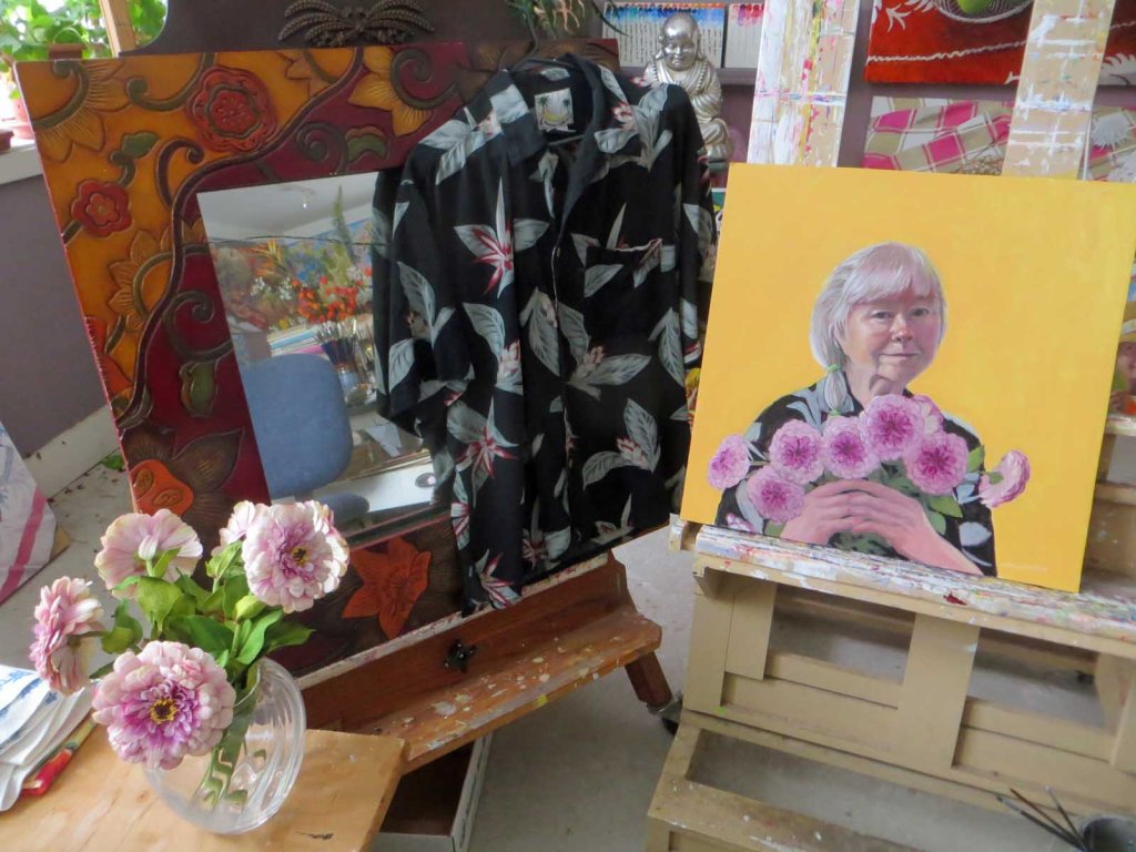 I brought one of my favorite Hawaiian shirts out to the studio, took off my heavy wool sweater and put on the shirt to paint. Started adding a bit of color to my portrait. Got about as far as I could today. Everything’s wet and gooey, so I had to quit. And go out into the snowstorm.