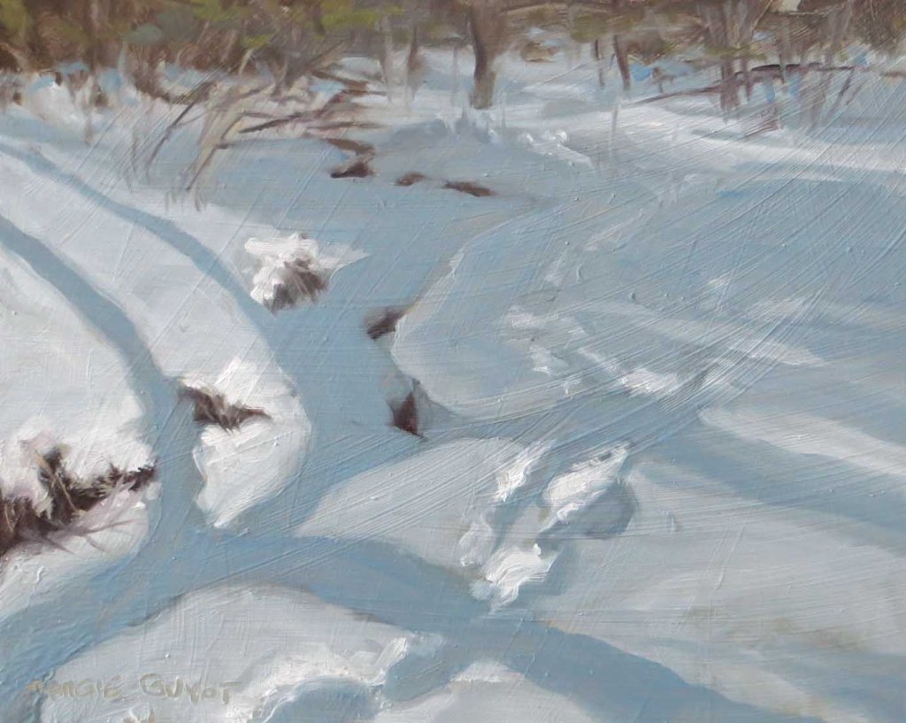 It wasn’t long before I felt bad about wasting such a gorgeous day, so I bundled up again and trudged through the snow out to my favorite spot in back of my studio. I love the shadow patterns falling across the snow. The creek’s frozen over at the moment. Lots of deer tracks! I scared up a ruffed grouse on my way back there.