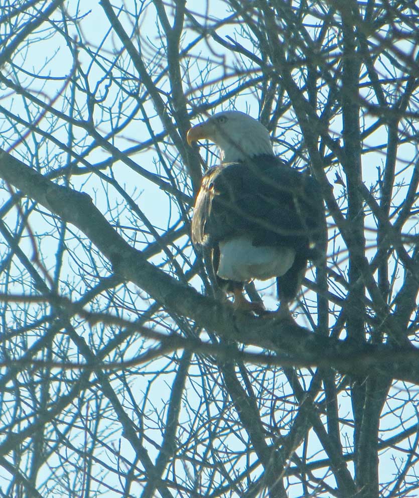 Painting in a stiff wind and blinding sunlight gets exhausting, so we decided to call it quits for the day, come back to my house for some soup. On the drive home we saw 2 bald eagles feasting on a roadkill possum on the road. I managed to get a shot with my little point & shoot: