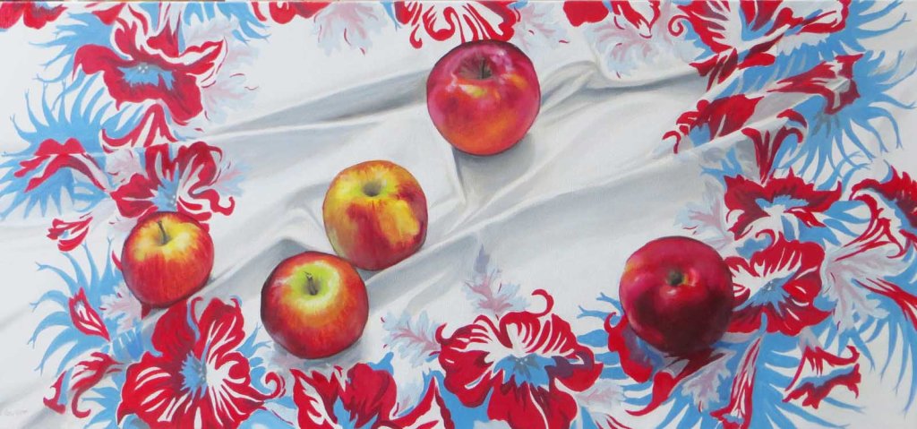 Half the time when I painted this, it was zero degrees outside. But I think the pattern of this tablecloth is kind of tropical-looking, so it kept my mind off the weather. It was a lot more pleasant than crawling out onto the ice, being battered by the relentless winds! I should do another painting with this and pair it with Hawaiian-type stuff. Or maybe summer things, like a platter of hot dogs. Celebrate the finish of it by having a hot dog feast for the poor possums. The apples I used for this were old “deer apples” and way past their prime. So – a feast for the deer — and possums….