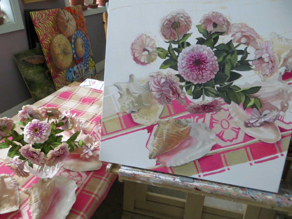After getting the basic drawing in, I went for the leaves. I’d always considered the leaves to be the hardest. Hah! Then I started doing the flower petals but after a day of suffering with those, I dropped down to the conch shells “for a break”. Hah. They were hard, too. So this morning I made myself go back to the petals for a few hours. Eventually I decided to tackle that cloth (actually a blanket). OY! I’d painted it once before and had forgotten how difficult it was. That design is not the easiest thing to figure out. So friends, life – and painting – is sometimes quite the struggle! I think it’ll be pretty good once it’s finished, though.