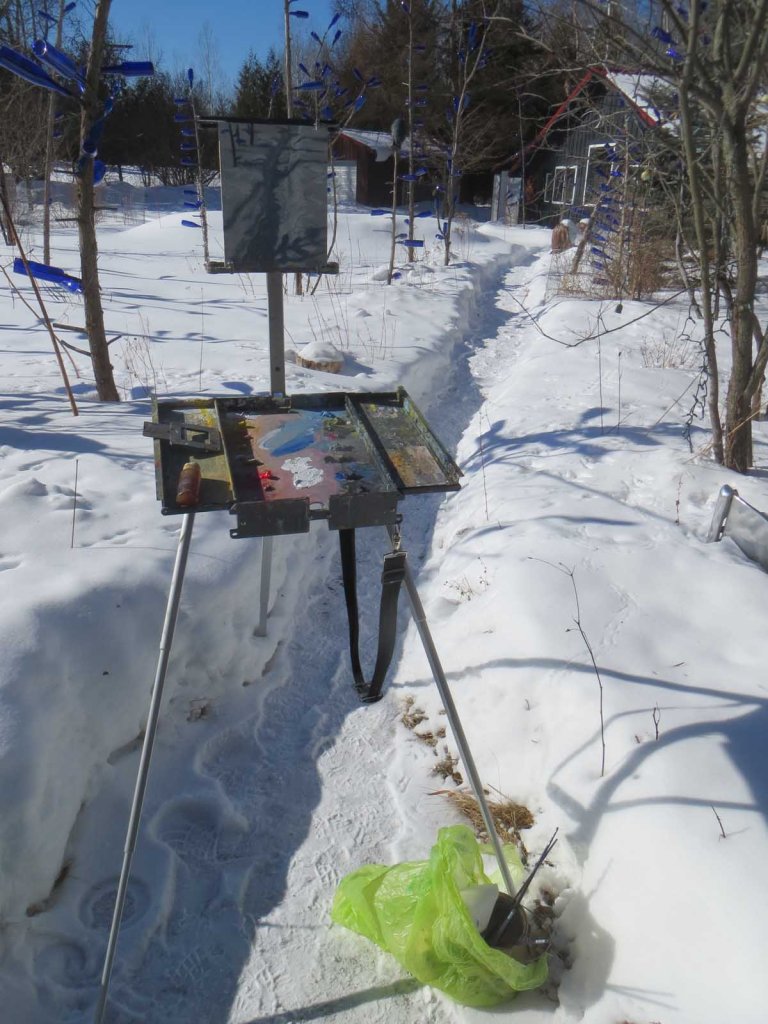 Frustrating! I couldn’t help but notice how interesting the path from the house to the studio looked today. At first I didn’t think I could stand out there and paint it (it was 18 degrees, up from a nighttime low of minus 8). I have Reynaud’s syndrome and my fingers get horribly cold at times. But I decided to give it a try. What the heck. I could always quit. Here’s my setup: