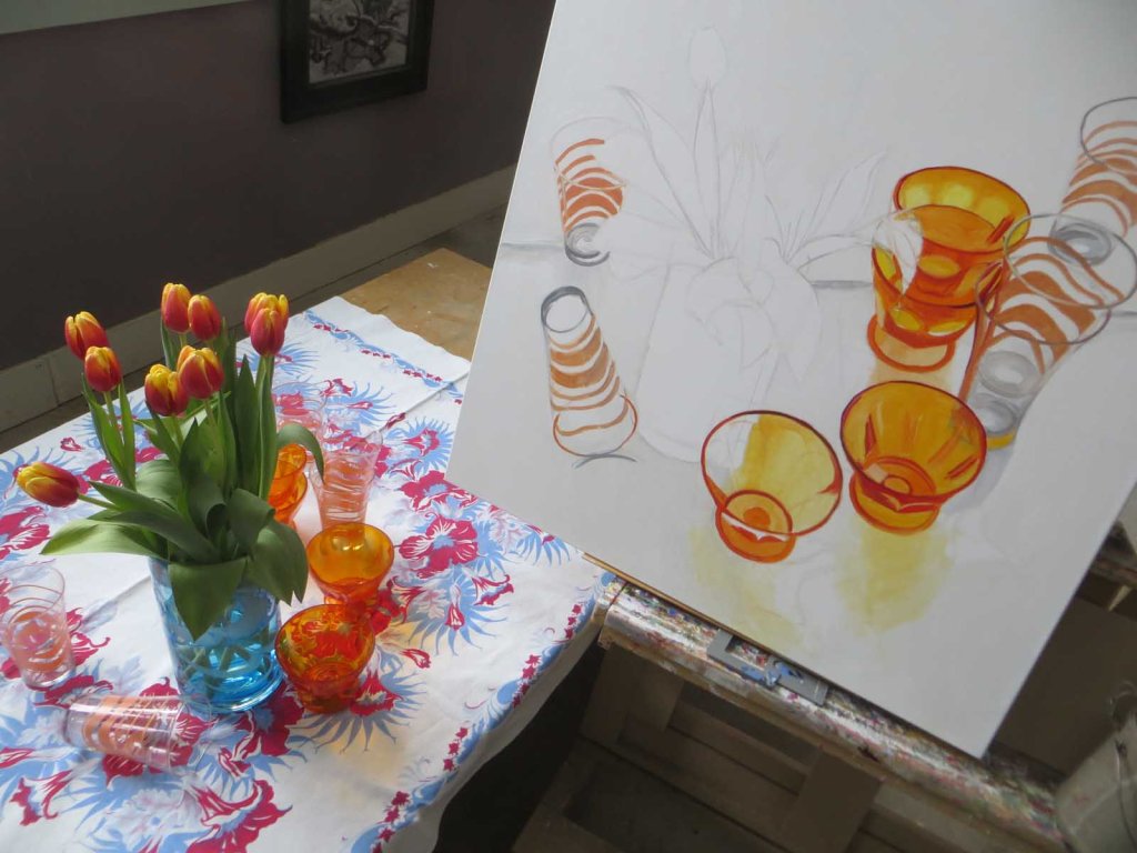 Don’t bother looking for Day 1. It was so pitifully drab and bare, I couldn’t bring myself to litter the Internet with it. Today I grabbed for the bright oranges and yellows and started in on some of the glassware. Good colors for right now. Outside, it’s all depressing as hell: dark skies and heaps of snow. Tonight we’re expecting an ice storm. So smearing dabs of bright oranges and yellows is quite theraputic. I’d learned years ago that when painting glass objects, it’s critical to paint the designs on the backsides first. Let dry. Then tackle the designs on the front sides. So that’s my excuse. And then there’s the tulips. They’ve been sitting in that container of water for two days now. I’m waiting for them to open up a bit like showgirls and swirl around in gawdy shapes. Normally my rule is: paint things that will die first. But store-bought tulips often take a few days to fully open. Patience! It’s a good day to put away my brushes a little early, don my pajamas and snuggle into bed with my 3 cats and read, waiting for the snow and sleet to start. And what am I reading? Stories about explorers, stranded in the ice in Antarctica, of course…..