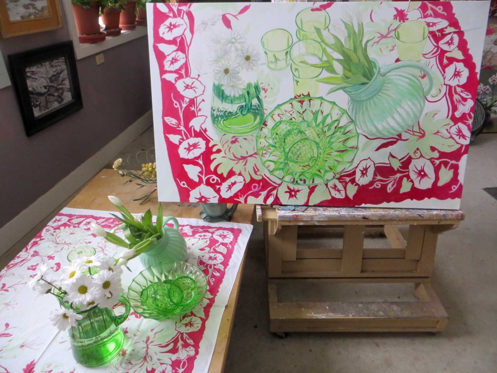 More snow! A great day to be in a warm studio, struggling to paint a tablecloth! It’s been tricky, but I think I can make things look pretty good eventually. That big, green bowl in the center — it’s been the most fun to add specks of reflected reds from the tablecloth. The next day it’s sunny I’ll turn my attention to the green pitcher on the right. There will be reflected reds on that, too. Such an exciting life — waiting for the sun to come out!