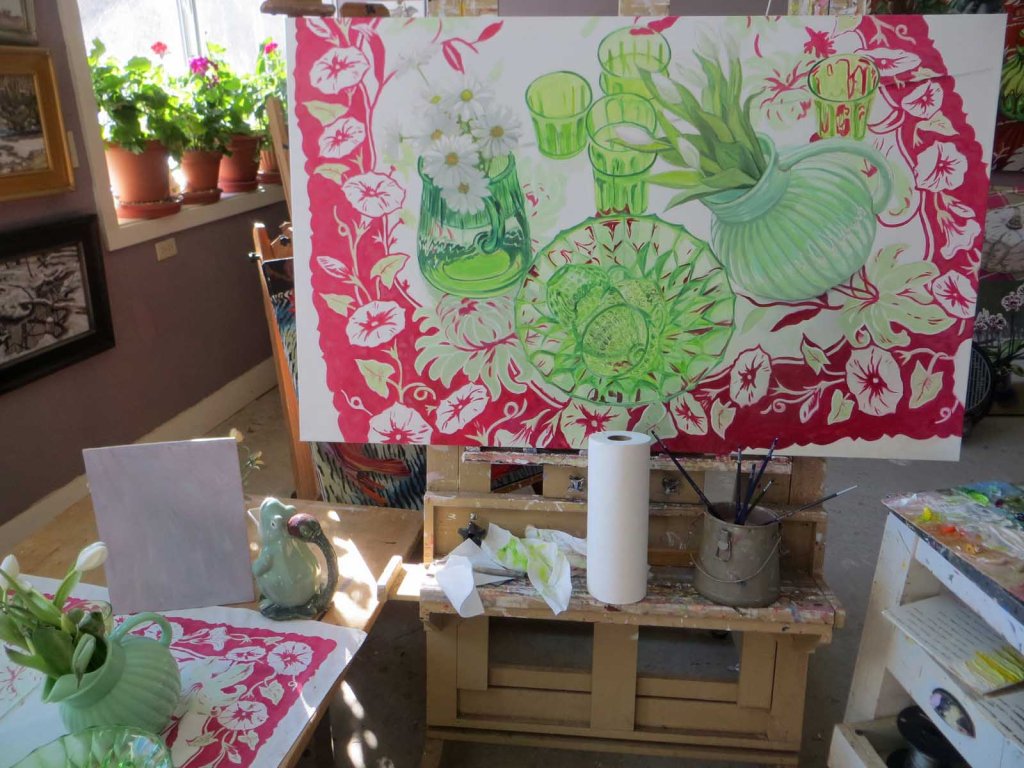 Maybe tomorrow I can finish this, but it’s supposed to be cloudy for the next 5 days. I need sun to see how the shadows look coming from the glasses. I didn’t think of it until too late. Maybe I can work on the daisies a little more. White daisies against a white tablecloth…..