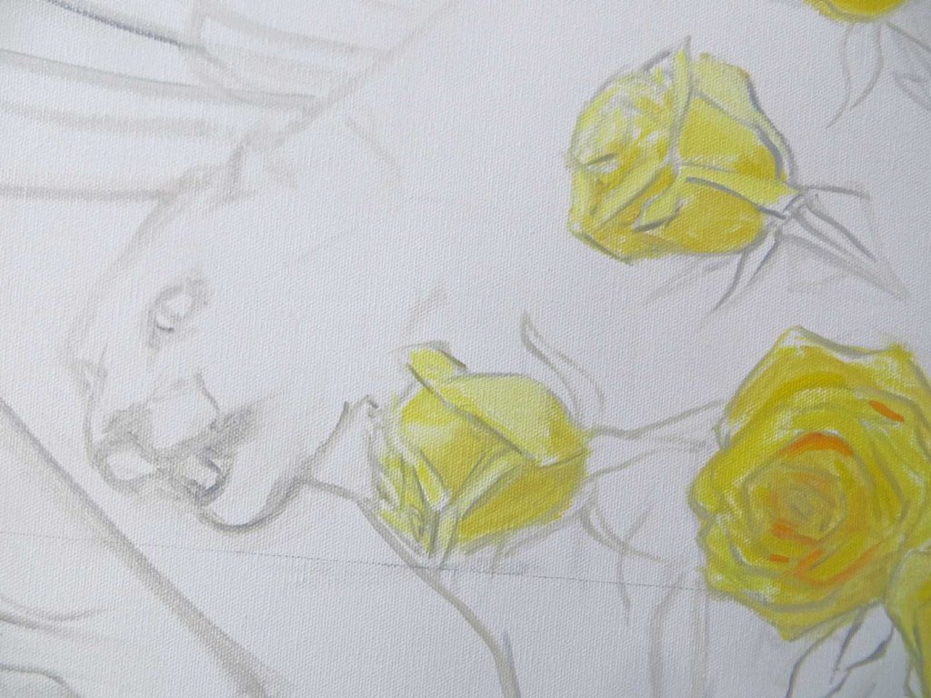 Started a new one, loaded with roses. As they say (and it’s true!), the first 10,000 are the hardest. After that it’s a snap. I struggled to try to get them nailed today. Grocery store roses could crap out overnight. You just never know. And what’s that thing with the roses?