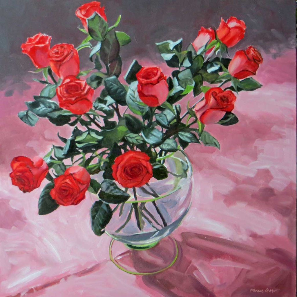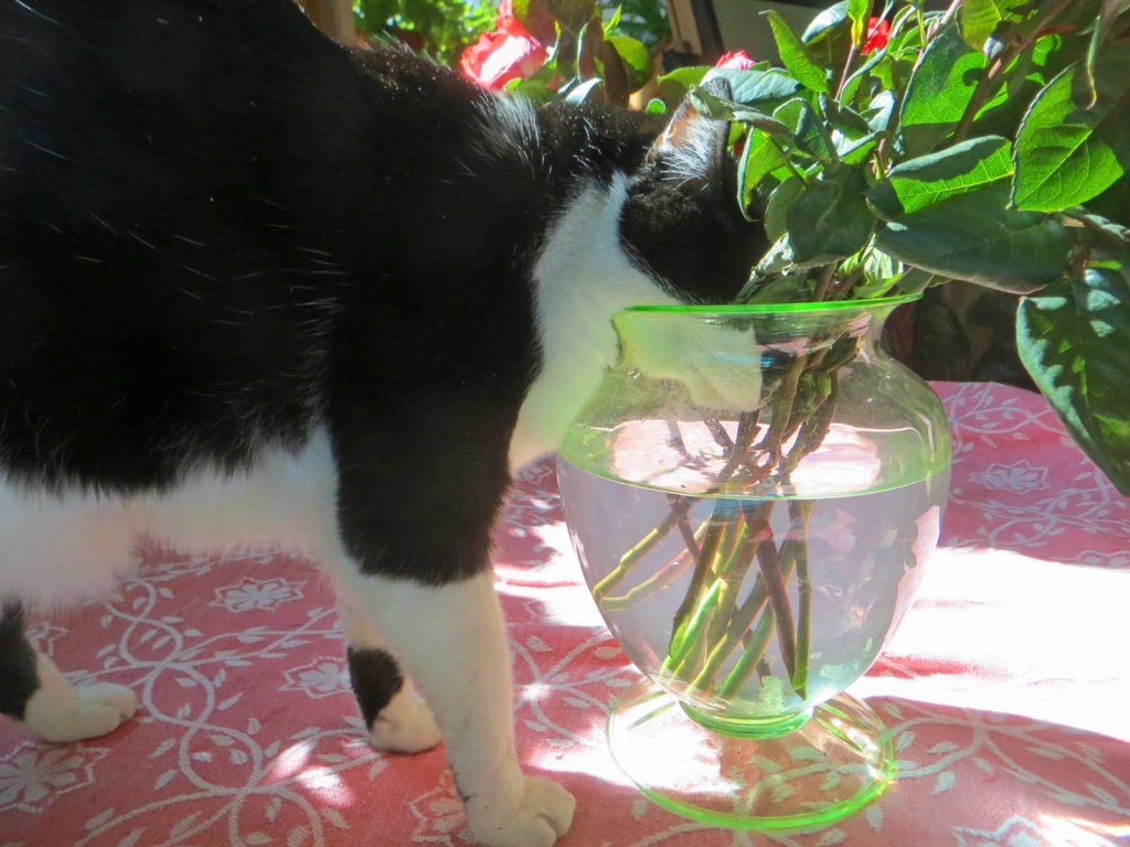 Finally — a bright, sunny day! I was able to see some of the bright greens. Painted hurridly — the rain returns tomorrow. And here’s a photo of my #1 cat, Picasso, rearranging the flowers so he can get a drink. Never mind that he’s got a bowl of water 3 feet away!