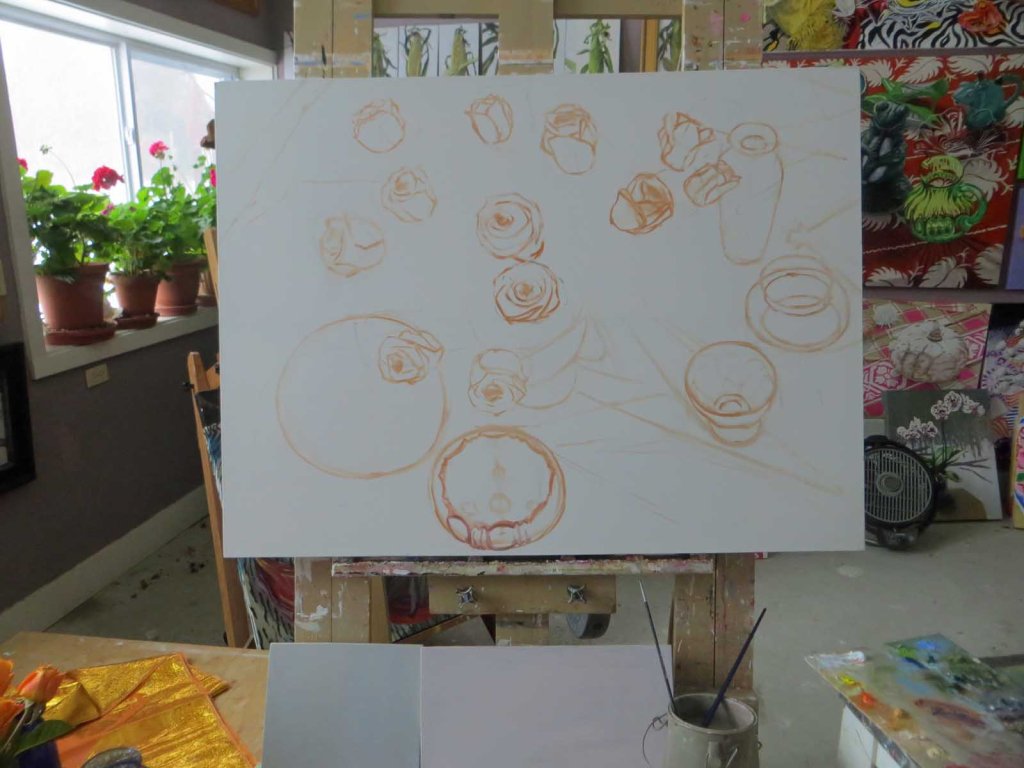 Here’s how it looked after about the first hour or so. But what else was there to do today? Snowing and bitterly cold outside. Better to stand in a nice, warm studio and struggle with roses.