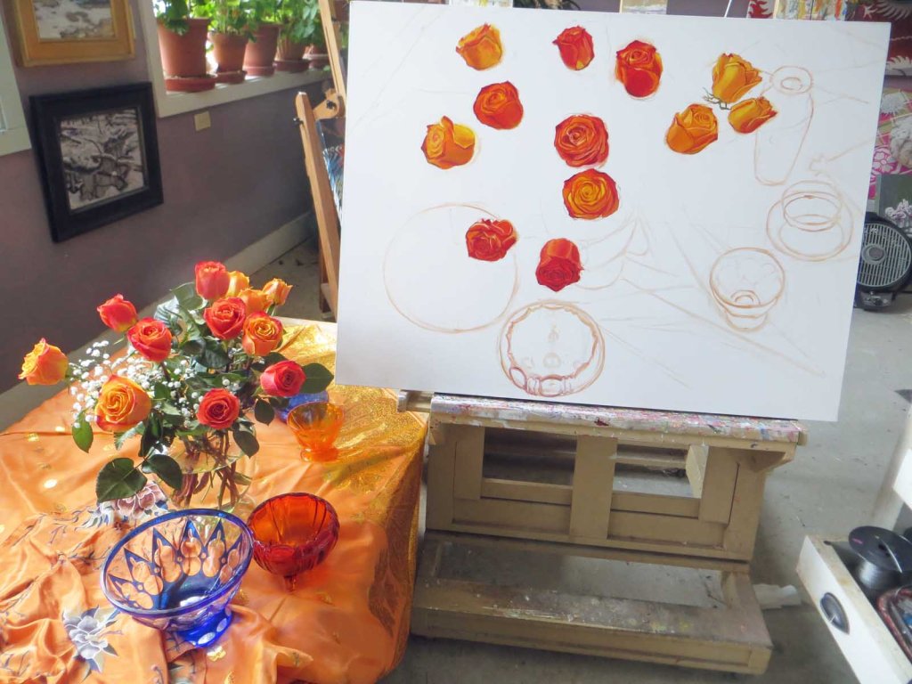 Hours later, I pretty much have the blooms painted. They’re the thing I worry about the most. They could be dead in a day or two. I saw these in the grocery store a couple days ago and loved the color. I happened to have a pale orange Indian sari and some blue bowels to play around with. I realized years ago that the paintings that seemed to jump out at me in galleries were ones made predominantly of contrasting colors.