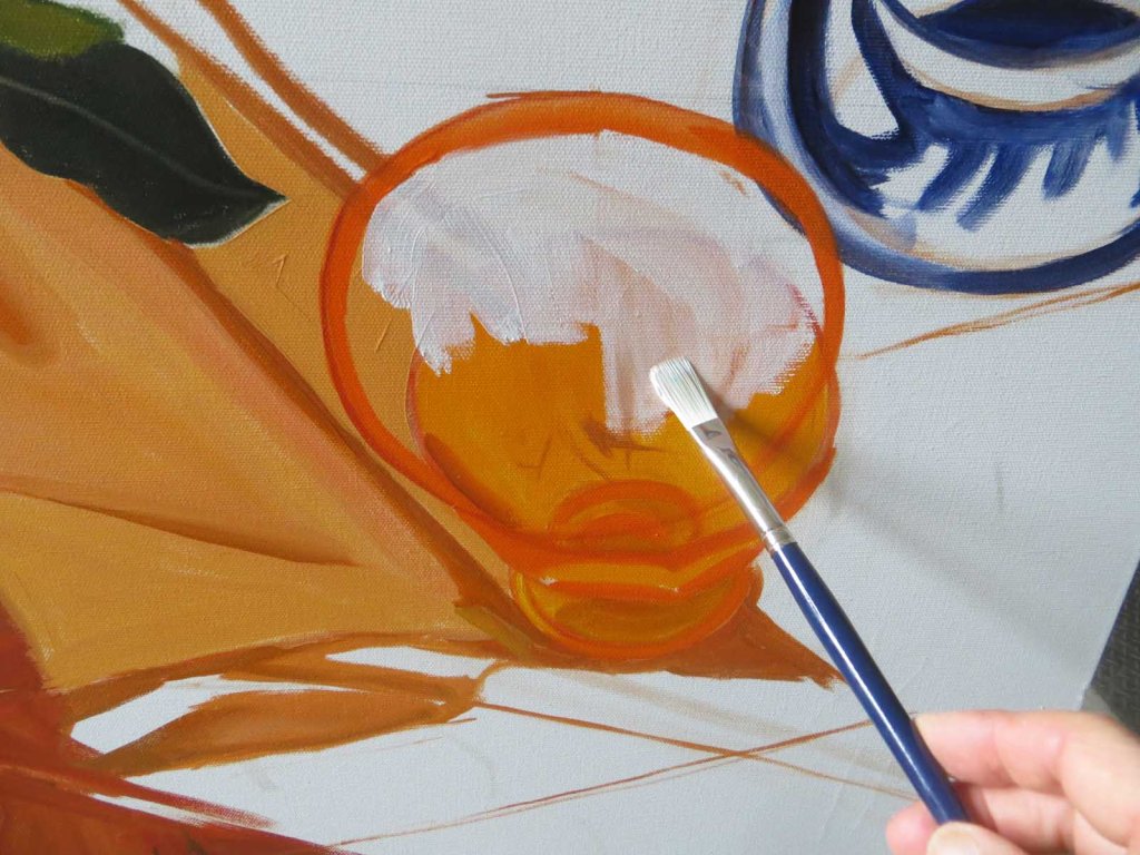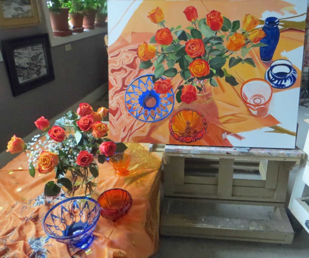 Right off the bat I realized one of the bowls needed to be moved — just a little. When I drew this in I was in a big hurry, trying to paint the roses before they croaked. Today I went ahead and re-drew one of the bowls and covered the old one with a thin coat of white paint. Maybe I’ll have to give it a 2nd coat of white. That might take a few days until it’s dried. If I have a white surface to paint on, I can give it a coat of thin cadmium orange (thinned with Liquin). That way, it’ll have more of a transparent-glass look. As opposed to opaque, if I had to use thick orange paint.