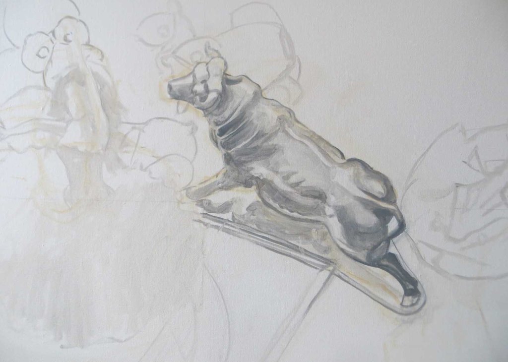 Most of the snow has melted and gardening season has begun, so much of my free time is spent toiling out in the dirt. I decided to set up a new still life – one with no fresh flowers to die! I’d found this ceramic bull a few years back and was in the mood to use him in a painting. He was kind of tricky to draw in. Yesterday I drew him in with gray paint and tried to address the shadows and muscles, etc. A kind of “grisalle” (sp?) to see if I could get it right before committing to color. Here’s how he looked yesterday: