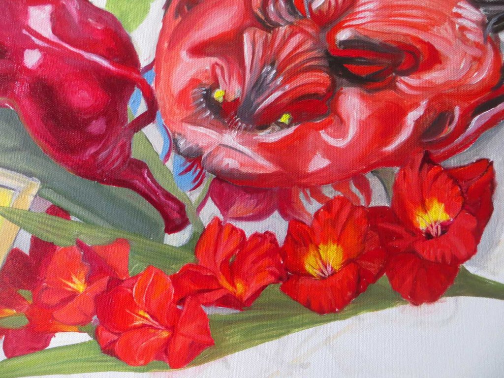 Thank goodness for silk flowers! I held one stem in my left hand and painted. Kind of tough, but it was SNOWING outside, so gardening was kaput. I like adding a stem of gladiolas when necessary. They kind of help keep the eye moving around the composition. Kind of like a helping hand, scooting the kiddies along.
