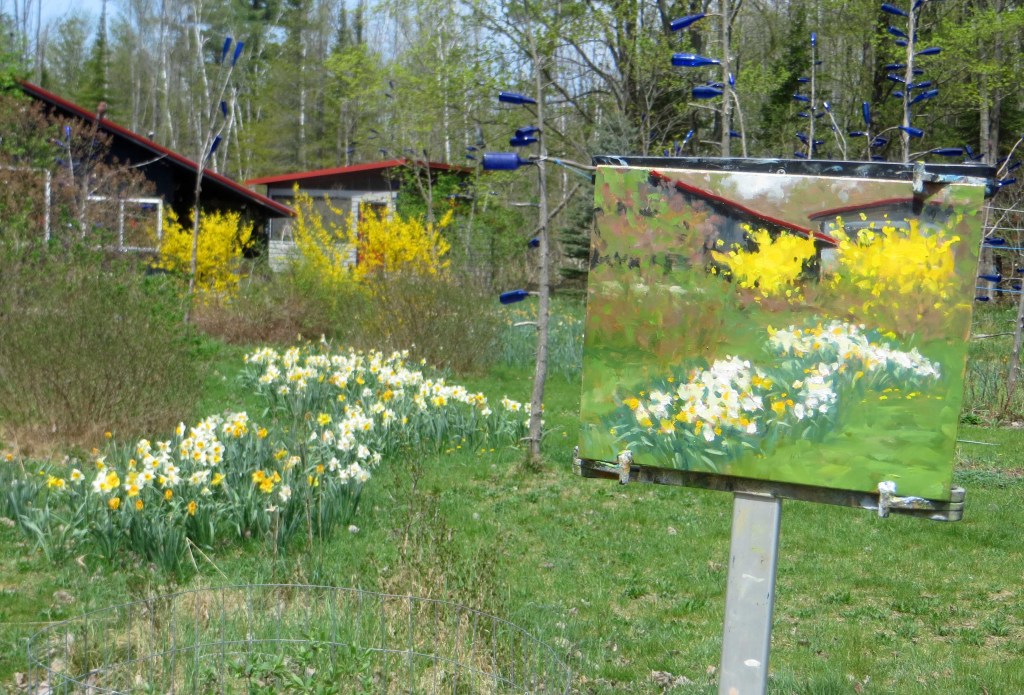 This is in my front yard. I’ve been awfully busy lately, planting my garden and schlepping paintings to galleries, so plein air painting has had to wait. I noticed this view last night – after having driven 4 hours, delivering paintings — and was too tired to paint. In fact, I’d gone to bed at 6:30 last night! Up at 4:30, of course. Refreshed, I got out there today to give it the “good old college try”. A bunny rabbit hopped right by me three times. Curious wasps buzzed around me, considering building a nest under my Hawaiian shirt. We’ve been having an unusual heat wave just lately — up in the 90’s, so my poor little daffodils won’t hold out much longer. I had to paint them! And my camera is on its last legs. Alas, Mercury is in Retrograde. Not an ideal time to buy electronics. So we’ll see how it goes…..