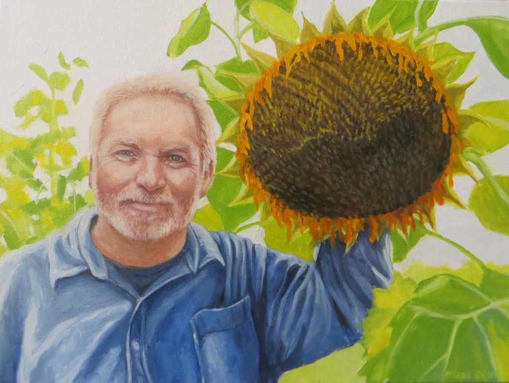 A man of many talents, Rusty raises Scottish Black-Face Sheep, fancy chickens (? pheasants? some kind of bird!), plays a variety of musical instruments, has lived all over the world, and is famous around here for his vast dahlia garden. Just to name a few attributes. Bordering his vast dahlia patch are the most humongous sunflowers I’ve ever seen. Monsters! Last fall friends and I were strolling the dahlias, ooing and aahing when I snapped this photo. The other morning I woke up, seeing it in my mind, thinking I need to paint this!