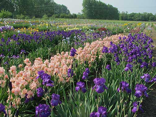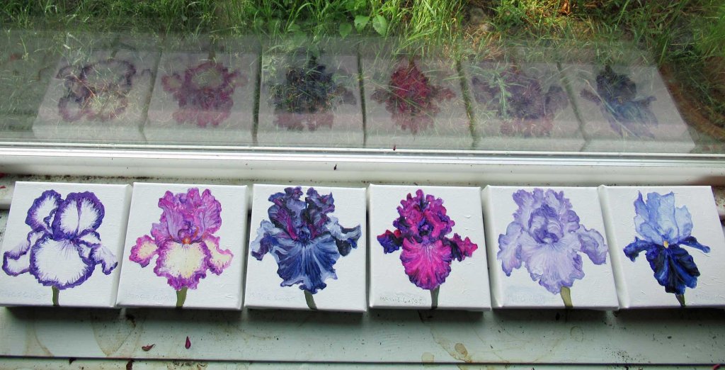 Finally — the snow’s melted and the iris are blooming! I had an iris-painting marathon this week. They’re all in oil, measuring 6×6″. Many are varieties from the Iris Farm, west of Traverse City. Alas, it’s now closed. It used to be a popular spot to spend the day picnicking, painting — or just walking around in a daze. Every year I’d go, meaning to just look and enjoy – and not buy anything but sure enough — I’d buy more and more. Here’s a photo of the good old days there. Can you imagine the smell?