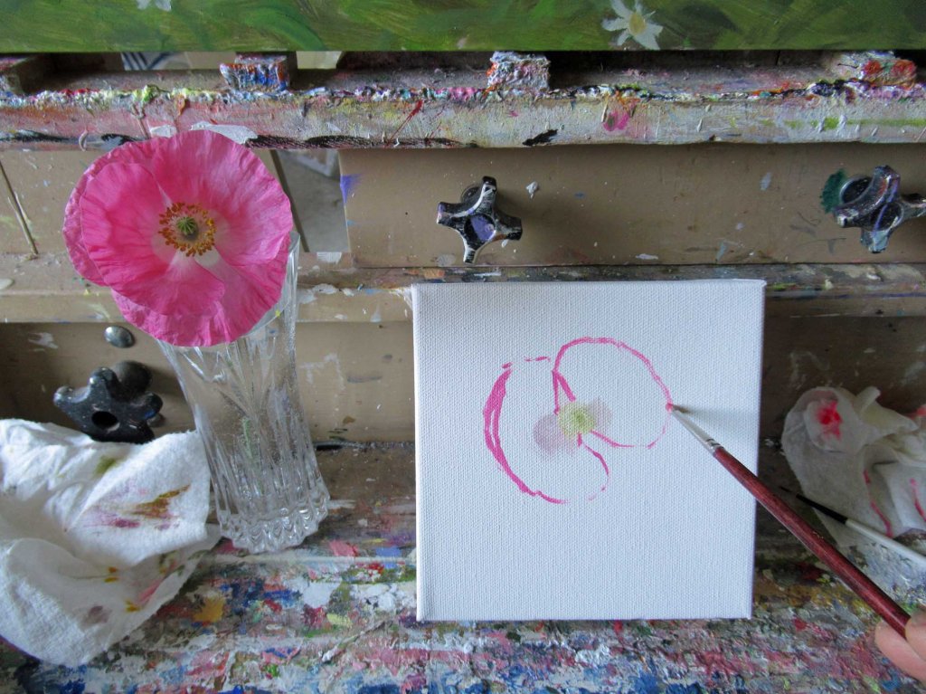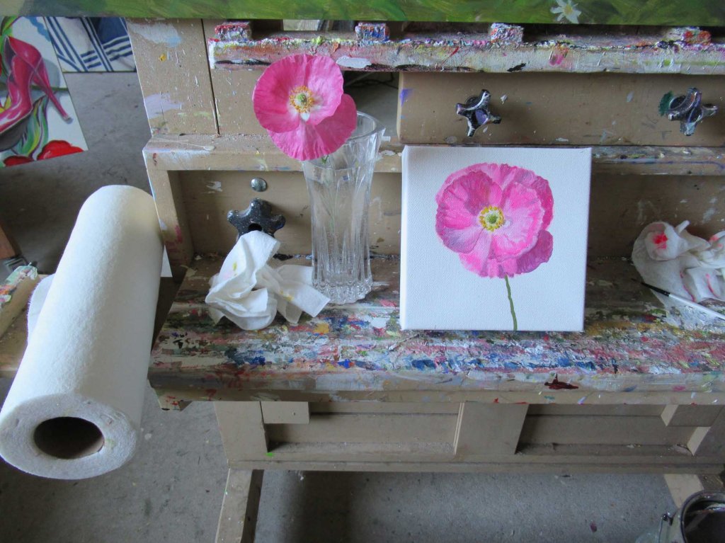 This is my setup for painting poppies. This morning the first of the pink poppies opened up. Hoping to see some peach ones soon. I work directly from life as much as possible. Here’s what they look like in the beginning: