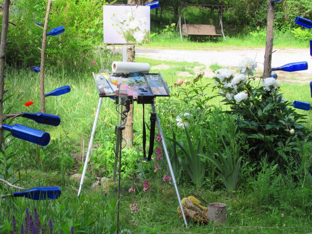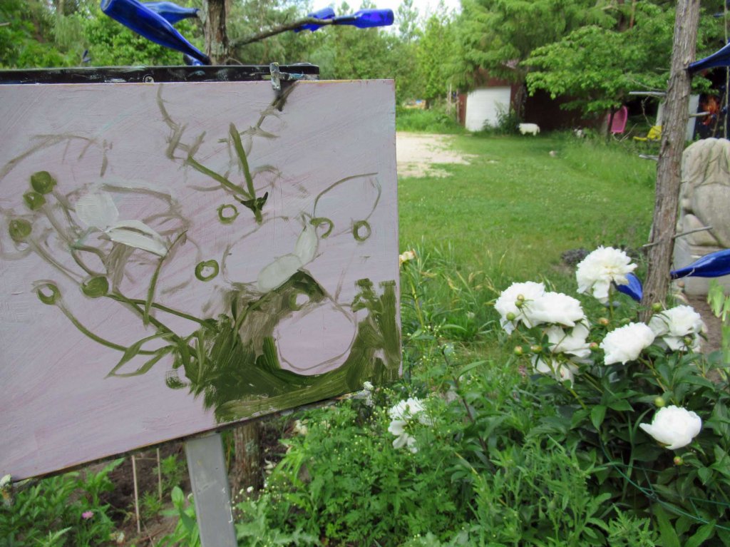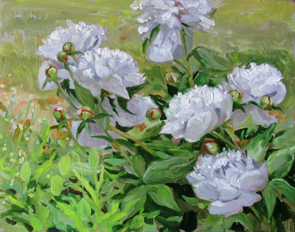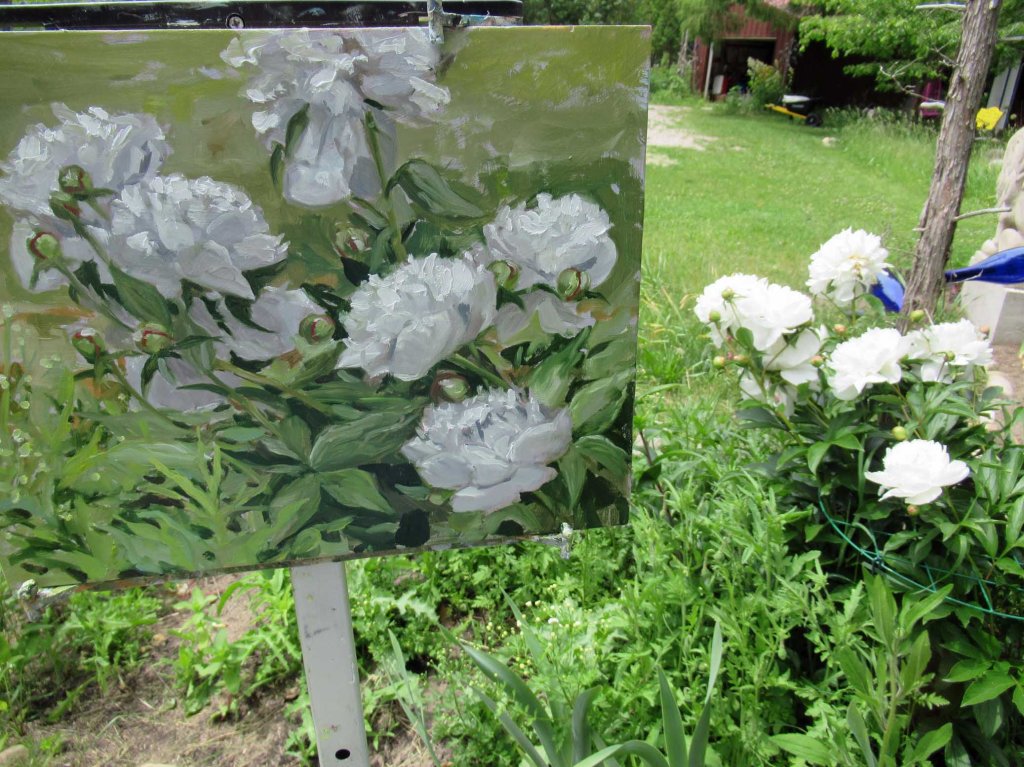 It was hard, but I finally managed to pull myself away from gardening chores this morning and paint my clump of Festiva Maxima peonies. Bloom-time is only about a week so I had to choose between weeding and painting.