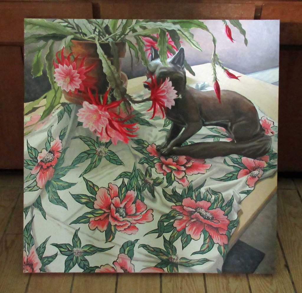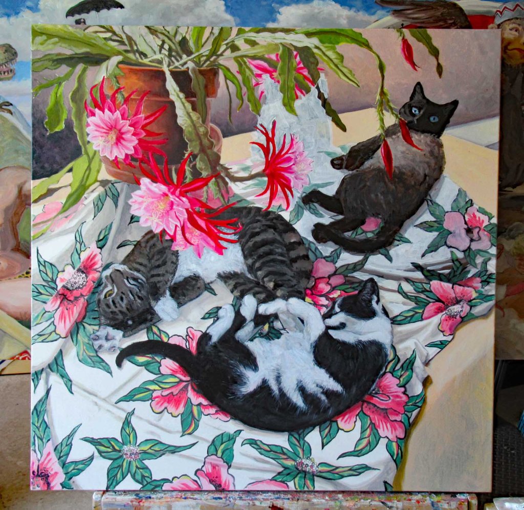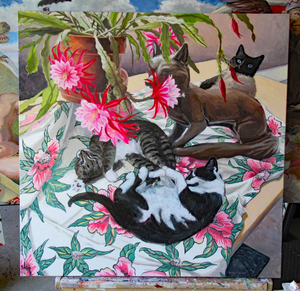 Of course I had to add my 3 beloved cats. Mr. Wonderful (the mackerel tabby in the middle) started out being painted way too small, like a little kitty, so he ended up being painted 3 times before IU got him to the right size. He’s a big boy. That’s little Bernie Sanders, the Siamese, in the back. And Picasso (my #1 boy) is in the foreground. Oh, and the plant? It’s one of my orchid cacti. Why settle for a pothos when you can have something spectacular?