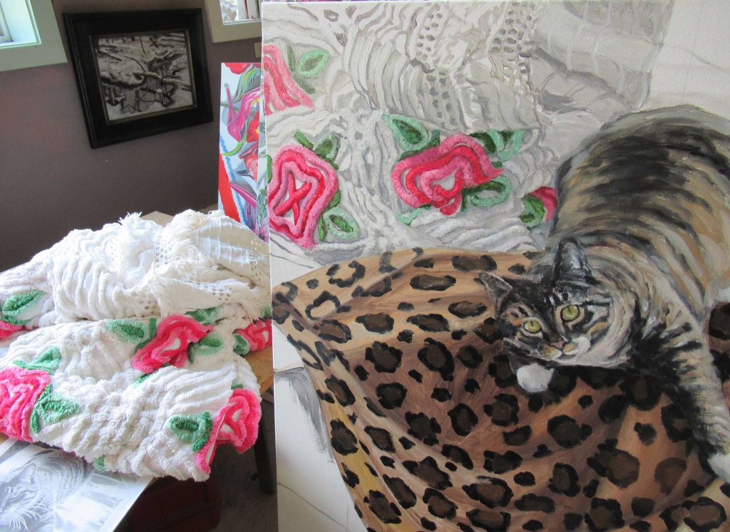 Life wasn’t enough of a struggle — I had to add this chenille bedspread. Somewhere in this house I’ve got a polka-dot one. It would have been easier, but nooooo! Struggle was on today’s agenda. Otherwise it just gets boring. I tossed the spread onto the table and started “digging in”. It looked pretty “iffy” in the beginning, but my recent days of laying a stone pathway out in the yard had toughened me up for just about anything.
