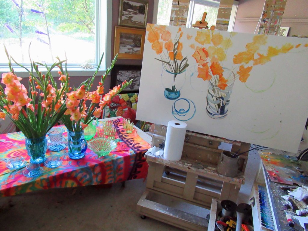 Of course I had to start out the day by pruning out errant wild blackberries from my blueberry patch. Mindless tasks like this help clear my mind for painting. Finally got into the studio. Oh, where to begin a crazed mess like this? I always try to find whatever is in the middle. In this case, it was the handle on the blue-swirl vase. I wanted to “sort of” establish where the main objects were. Then I thought I’d start mushing in the orange flowers. But then I saw how it result in one of those “tragic follies”. So I dropped trying to focus on the flowers and started laying in suggestions about where the green stalks would go. And, being a “glass-aholic”, I found it absolutely irresistable to stay away from the swirls on the glass! Ah, well…