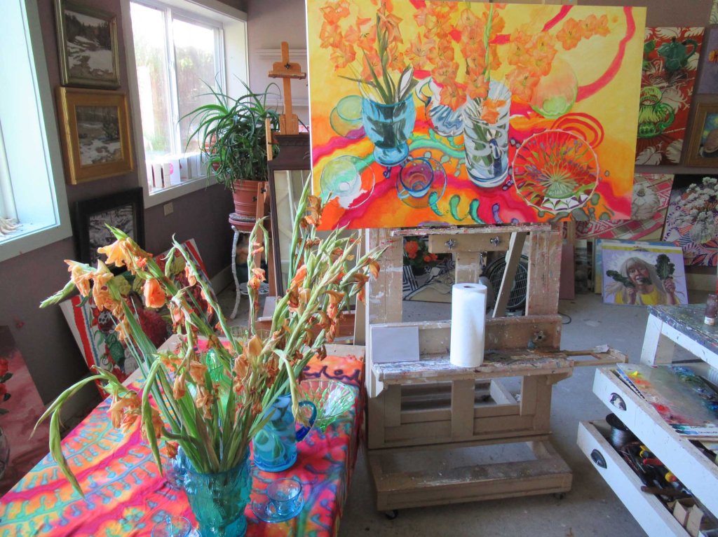 An absolutely gorgeous day. It was hard to get into the studio today, but I did manage to make some headway. Started dealing with the bowl on the lower right. A toughie! The gladiolas are fit for the compost pile. I smashed one of my fingers yesterday, so typing isn’t easy. This will be a short one today.