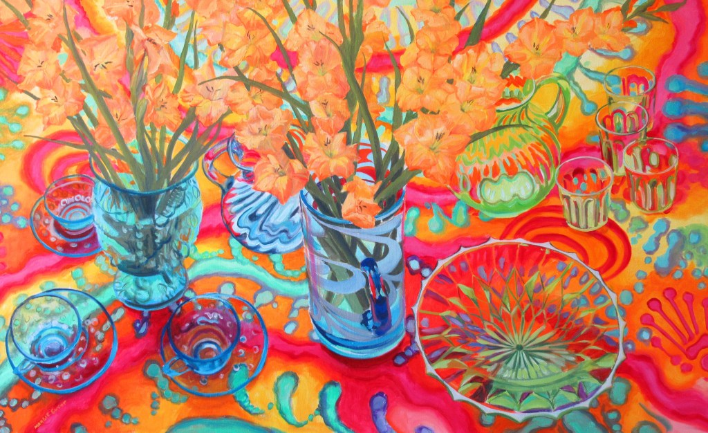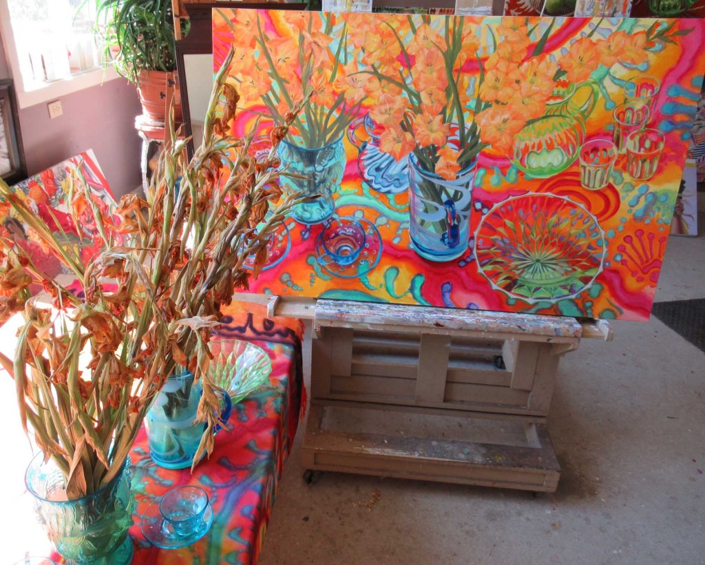 Whew! I’m glad to call this one “done”. It was a toughie. For days it teetered on the edge of “wonderful/horrible”. At least I like it. Little known fact: at the end of every painting, I say to myself: someday they’ll be FIGHTING over this! The gladiolas died right away. I saved them until the bitter end. Now they’re on the compost pile.